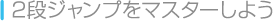 | アイテムを取るときや、高い場所に移動するときなどは、2段ジャンプを使う必要があります。いつでも出せるよう、2段ジャンプのタイミングをマスターしましょう。また、ジャンプ中にクロービスが壁にぶつかると落下してしまう点にも注意してください。 | ![]() |