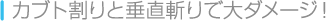| カブト割りと垂直斬りは、ほとんどの敵を一撃で倒すことができます。状況や敵に合わせ、2つの斬りかたを使い分けて戦いましょう。 | ![]() |