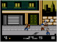 | 199X年、核戦争後のニューヨークの街は 暴力に支配されていた。 街の外れで双子の兄弟が暮らしていた。 兄がジミー・リー、弟がビリー・リーという。 2人は5年前、クン・フー道場を経営していた。 しかし、5年前の核戦争で道場は焼き払われ、 2人は道場を解散するのであった。 弟のビリー・リーは6年前から、 女子部の師範代を務めていたマリアンと 恋愛関係の仲であり、兄のジミー・リーも密かに マリアンに恋をしていたのであった。 ある日のことである。 ───マリアンがブラックウォリヤーズに誘拐されたのだ。 ブラックウォリヤーズ、それは街を支配する暴力グループであり、核戦争後じわじわと組織を大きくしていった。 主人公ビリー・リーは、兄には内緒でマリアンを助け出すため ブラックウォリヤーズに1人立ち向かうのであった。 |