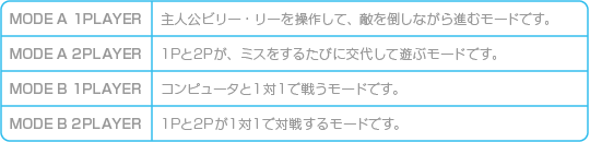 ビリー・リーのアクションを駆使して、敵を倒しながら進んでください。ダメージを受けてライフがなくなるか、穴などに落ちるか、残り時間がなくなるとミスになります。ミスをするとプレイヤーの残り数が1つ減り、プレイヤーの残り数が0のときにミスをするとゲームオーバーです。