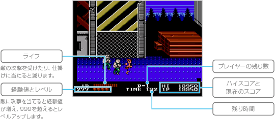 敵に攻撃を当てると、攻撃の種類によって経験値が手に入り、経験値が999を超えるとレベルアップします。レベルアップするとビリー・リーのアクションが増えたり、強力になっていきます。なお、レベルはハートマークで表示され、最高でレベル7まで上がります。 |