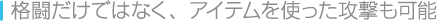 敵はナイフや鉄パイプなどのアイテムを持っていることがあり、相手をダウンさせるとアイテムを奪えます。アイテムを使えば、遠くの敵や大勢の敵を同時に相手にすることができます。 ![]() |