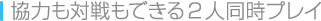 2人プレイには、味方同士の攻撃があたらないAモードと、味方の攻撃があたるBモードがあります。Aモードでは2人で協力しあってゲームを進められ、Bモードではお互い戦いあいながらプレイすることもできます。 ![]() |
