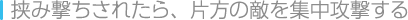 | せまい通路で前後を敵に挟まれてしまうと、逃げ場がなくなってしまいます。そのままでは両側から攻撃を受けてしまうので、どちらか一方の敵に集中攻撃し、逃げ場を作っておくと安全に戦うことができます。 | ![]() |