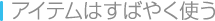 地面に落ちているアイテムは、一定時間経過すると消えてしまったり、再び敵に拾われてしまうことがあります。敵が落としたアイテムは、すばやく拾って使ってしまうのも手です。 |