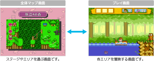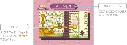 ミロンを操作してアモンの手下を倒し、「楽器」を手に入れて封印を解きながら全7ステージをクリアしましょう。各ステージはいくつかのエリアで構成されています。全体マップ画面とプレイ画面を行き来して進めてください。なお、新しく出現したエリアをクリアしていくことで、選べるエリアが増えていきます。 ![]() |