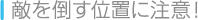 敵のなかには倒すと爆発するものがいます。巻き込まれるとミスになるので注意してください。 このとき真下にいれば爆発に巻き込まれにくいので、敵を倒すときは真下から攻撃するようにしましょう。 ※敵との距離がかなり近いと、真下でも巻き込まれてしまうので注意してください。 |