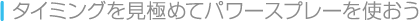 パワースプレーを使うと射程や威力が上がりますが、一度使うとミスをするまで出現しません。ここぞという場面で使いましょう。 ![]() |