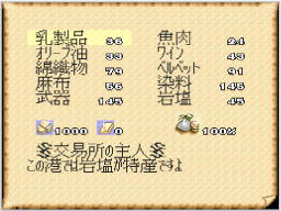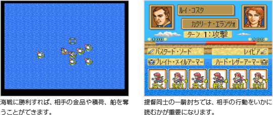 資金集めの手段の1つが交易です。ある港で安く買った商品を別の港へ輸送して高く売り、その都市で別の商品を仕入れて、さらに別の港で高く売る……。これを繰り返し、資金を集めていきましょう。変動する相場を読んだり、商品購入の際に値引き交渉をするといった、かけひきを楽しむこともできます。 |