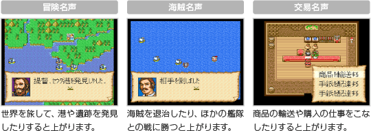 ゲームを進めると、主人公の名声が上がっていきます。名声には「冒険名声」「海賊名声」「交易名声」の3種類があり、それぞれ特定の名声が一定値以上になると、さまざまなイベントが発生します。 ![]() |
