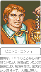 借金取りが詰めかけるコンティー家から、 ピエトロは、悪友・カミーロを探すために脱出した。 リスボンの貴族の家で働く彼が、 ジェノバに戻っているという噂を耳にしたからである。 ピエトロの予想通り、カミーロはなじみの酒場にいた。 「俺とリスボンに行かないか。 借金付きでもいいから、お前を雇いたいって人がいるんだ」 開口一番、カミーロは用件を切り出した。 カミーロは、なんとか彼に冒険の機会をもう一度与えてやりたいと思っていた。 今は落ちぶれているが、ピエトロは優れた冒険家である。 だが、彼をバックアップしていた父親が多額の借金を残して死んだため、 航海に出る術が失われてしまったのだ。 カミーロの話によると、 リスボンのフェレロ公爵家は、世界の情勢をいち早く入手するため、 実力のある冒険家を探しているらしい。 「悪い話ではなさそうだな。相手に会わせてくれよ」 |