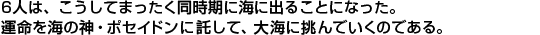 「エルナン、まだ生きているか」 声の主は、エスペランサ(希望)号の船長、ミカエル・エランツォ。 イスパニア海軍士官として、名声をほしいままにした人物である。 ミカエルの船は、航海中に突然、大船団に囲まれた。 次々と斬り込んでくる水夫たちに向かって、皆、必死で戦った。 ──だめだ。いくらなんでも多すぎる。 あまりにも苦しい戦いだった。 ミカエルの手は、すでに敵兵の血で赤黒く染まっていた。 彼が自分の体を支えきれなくなり、床にひざをついたときには、 敵兵は船に火を放ち、ゆうゆうと引き上げようとしていた。 ──逃がすものか。 しかし、もはやミカエルは、立ち上がることすらできない。 なんとか顔を上げた彼の眼に、副官・エルナンの姿が入った。 彼の親友であり、妹・カタリーナの婚約者でもある。 せめて、エルナンだけでも、カタリーナのためにイスパニアに戻ってほしい。 そう願って、ミカエルは彼の名を呼んだ。 しかし、返答はなかった。 「イスパニア艦隊、サント・ドミンゴ沖で消息を絶つ」 恐るべきニュースは、ヨーロッパ中に広がっていった。 |