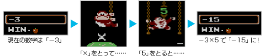 「CALCULATE」はジュニアを操作して数字や+・−などの計算記号をとり、 ドンキーコングが示した数字(答え)を完成させるゲームです。 |