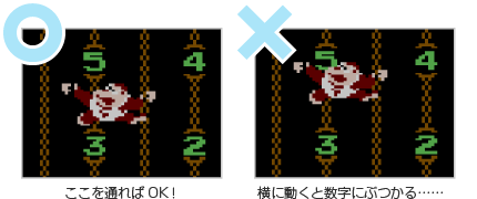途中で数字をとり間違えてしまうと、最初に考えた計算の手順を変えなければいけなくなってしまいます。ロープをつたって横に移動するときは、必要のない数字に触れないように注意しましょう。 |