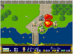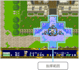 自軍フェイズでコマンドメニューを選び、自軍ユニット(キャラクターを表すコマ)に移動や攻撃などの指示を与えてください。指示を終えたら 自軍フェイズと敵軍フェイズを繰り返し、「敵の全滅」などの勝利条件を達成するとシナリオクリアです。 |