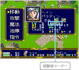 敵を倒したり、回復魔法を使用してHPを回復すると経験値メーターがたまっていきます。経験値メーターがいっぱいになるとユニットがレベルアップし、攻撃力や防御力などの能力が上がります。 なお、傭兵が敵を倒した場合は、その傭兵を雇っている指揮官に経験値が入ります。 |