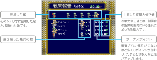 勝利条件を達成すると、生き残った指揮官に経験値のボーナスが入ります。そのあと戦果報告が表示され、敵ユニットを撃破した分だけお金が手に入ります。また、生き残った傭兵が多いと、攻撃力修正値が上昇することがあります。