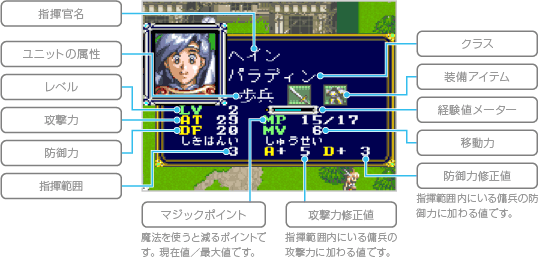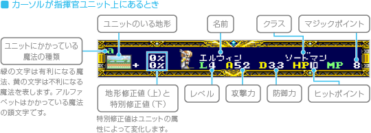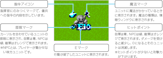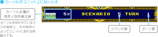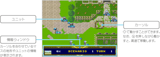 この画面では、ユニットを操作して移動や戦闘などを行います。