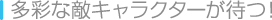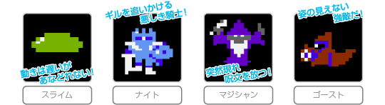 塔の中では、さまざまな敵キャラクターがギルを待ちかまえています。 ここに紹介する以外にも、火の玉「ウィル・オー・ウィスプ」や恐るべきドラゴンなどが登場。 個性的な敵キャラクターたちにどう立ち向かうかが、ゲームのカギを握ります。 ![]() |