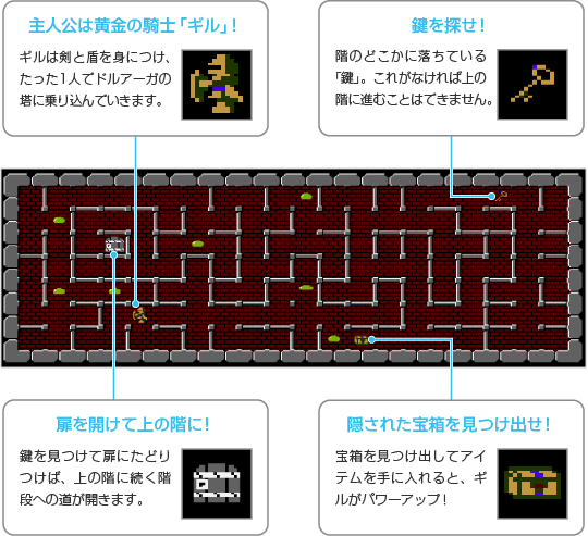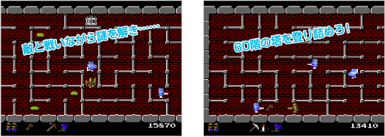 ゲームの舞台となるのは、全60階の「ドルアーガの塔」。 塔の内部は複雑な迷路になっており、さまざまな困難が待っています。 ![]() |