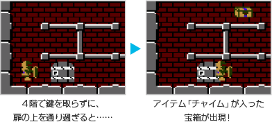 『ドルアーガの塔』最大の魅力が、階のどこかに隠されている宝箱を探し出すこと。 宝箱はある条件を満たすと出現しますが、その条件は「敵を倒すこと」「特定の行動をすること(しないこと)」といったシンプルなものから、「敵にある行動をさせること」「特定のボタンを順番に押すこと」など、一筋縄ではいかないものまでいろいろです。謎解きのおもしろさと、解いたときの爽快感を味わってみてください。 |