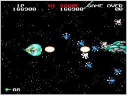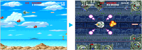 パワーアップアイテムを取ると、自機の武器などをパワーアップさせることができます。パワーアップさせられるのは、ショットやボム、ARMと呼ばれるシールドの3つ。どれもレベルが上がるたびに、強力なものになっていきます。 ![]() |