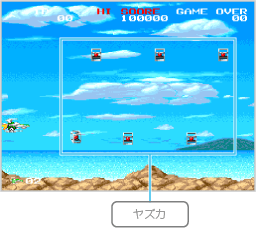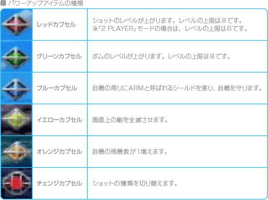 敵キャラクター"ヤズカ"の6機編隊を全滅させると、以下のいずれかのパワーアップアイテムが出現します。パワーアップアイテムを取ると、シルバーホークのショットやボムの威力、耐久力が上がるなど、さまざまな効果があります。また、一度レベルが上がると、ミスしても下がることはありません。 |