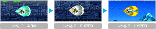 ARMは敵や敵の攻撃に当たると、耐久力が減って小さくなっていき、耐久力がなくなると消えてしまいます。 また、ARMが残っている状態でブルーカプセルを取るとARMの耐久力が増え、5個取るごとにARMがレベルアップします。ARMのレベルは3まで上がります。 ![]() |