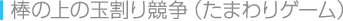 | ほかの1チームと組み、画面の中央に置かれた玉を先に割る競技です。組んだチームと協力し合うことがポイントとなります。玉が割られる前に制限時間がなくなると、全員失格になります。 | ![]() |