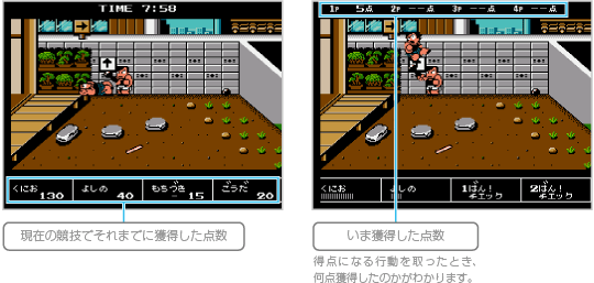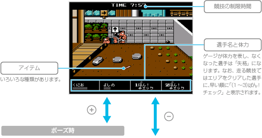 2人以上でプレイするときは全競技を最後まで行って順位を競い、1人でプレイするときは各競技終了時の総合得点で、つねに1位をとらなければゲームオーバーとなります。 また、「クロスカントリー」や「しょうがいべや」では、スタート時に合図のピストルが鳴る前にスタートラインを超えるとフライングになり、3回フライングすると失格となります。 競技中は ![]() ![]() |