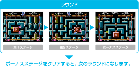 1つのラウンドは3つのステージで構成されています。第1ステージ→第2ステージ→ボーナスステージの順に進み、ボーナスステージをクリアすると次のラウンドに進みます。 ![]() |