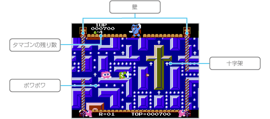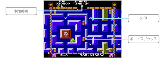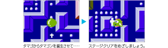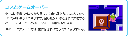 制限時間内に6つの「ボーナスボックス」の中からタマゴを探してください。通路の矢印を踏むと、画面が矢印の方向にスクロールするのでうまく利用しましょう。タマゴを見つけるとタマゴンの残り数が1つ増えます。 制限時間がなくなるか、すべてのボックスを開けると次のラウンドに進みます。なお、ボーナスステージでは、ミスをしてもタマゴンの残り数は減りません。 ![]() |