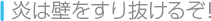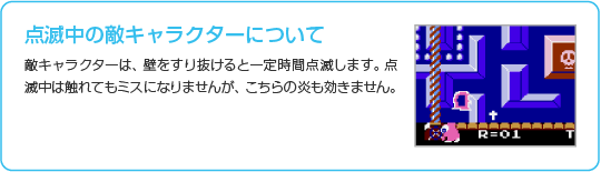 タマゴンが吐いた炎は壁をすり抜けるため、壁の向こうにいる敵も攻撃できます。ステージを進むうえで、覚えておくと便利です。 |