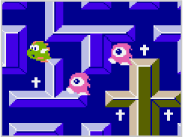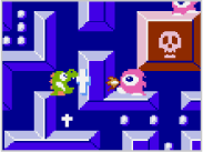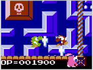 第1ステージでは、「十字架」がないと「ボワボワ」を消したり、敵に攻撃できません。「十字架」は一定時間がたつと消えてしまうため、つねに「十字架」を持っている状態になるように、ステージにある「十字架」の位置を把握しておきましょう。 |