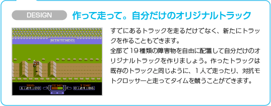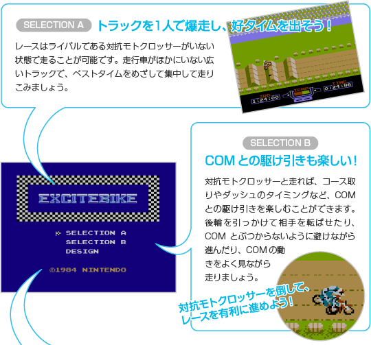 『エキサイトバイク』は1984年11月30日にファミリーコンピュータで発売されたレースゲームです。トラックに配置されたさまざまな障害物を乗り越えて、上位入賞をめざしましょう。 ![]() |