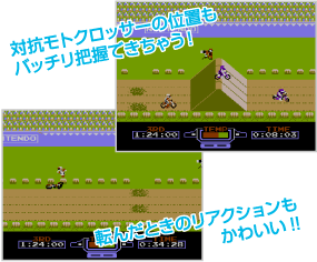 | 本ゲームではレースゲームによくあるプレイヤー視点の1人称視点ではなく、横からトラックを見ている3人称視点で表現されています。そのためトラックのアップダウンが一目でわかり、レースゲーム初心者でも遊びやすくなっています。また、操作するレーサーや対抗モトクロッサーなど、キャラクターのデザインがかわいらしく、見ているだけで和みます。 | ![]() |