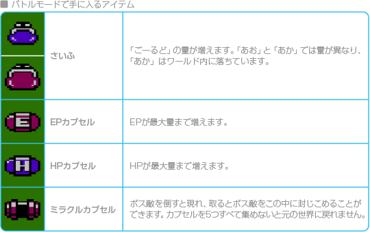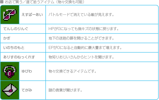 アイテムにはお店で買えるものやバトルモードで手に入るものなど、さまざまな種類があります。