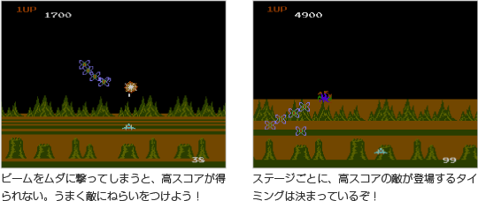 ビームを1発も外さずに敵に当て続けると、スコアがどんどん増えていきます。また、登場する敵のなかには、倒すと高いスコアがもらえるキャラクターがいます。逃さずに撃破しましょう。なお、スコアが20,000点、50,000点になると、ファイターEXの残り数が1機増えます。 ![]() |