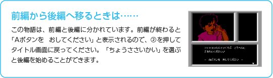 で進行状況を保存(セーブ)してゲームを中断することができます。「ちょうささいかい」でゲームを再開すると、中断した場所にかかわらず、探偵事務所から始まります。