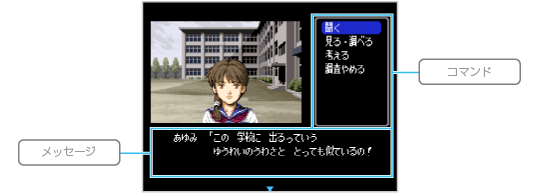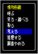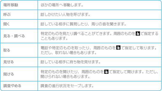 表示されるコマンドは場面によって異なり、ここで紹介する以外のものもあります。 なお、調査の進行状況によって表示されるコマンドは変化し、新たに増えたコマンドは黄色く表示されます。また、コマンドの数が増えると |