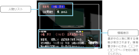 調査が進むと、人物ごとに集めた情報がメモ画面に自動的に記録されます。メモ画面を表示するときは、コマンドを選べる状態のときに ![]() |