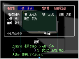 特定の場面でコマンド「考える」を選ぶと、プレイヤーがメモ画面上で情報を整理するイベントが起こります。( )の中にあてはまる人物名を推理して選んでください。 |