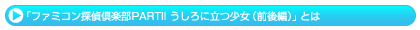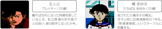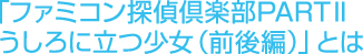 『ファミコン探偵倶楽部PARTII うしろに立つ少女(前後編)』は、空木(うつぎ)探偵事務所で探偵助手をしている少年が活躍する推理アドベンチャーゲームです。物語は前後編に分かれており、前編が1989年5月23日、後編が同年の6月30日にファミリーコンピュータディスクシステム用ソフトとして発売されました。今回は前編と後編の両方を遊ぶことができます。なお、このゲームのスーパーファミコン版もバーチャルコンソールで配信中です。 物語は1988年に発売された『ファミコン探偵倶楽部 消えた後継者』の数年前にさかのぼります。私立丑美津(うしみつ)高校を舞台に織りなされる複雑な人間関係、学校の怪談など、謎と恐怖が盛りだくさんです。 |