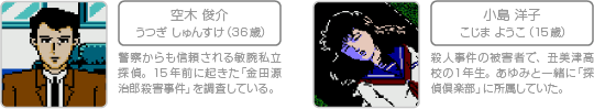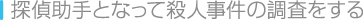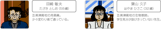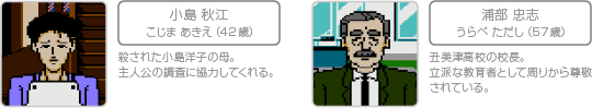 今回の殺人事件は、丑美津高校に伝わる怪談と深く関係しています。被害者と同世代で学校での聞き込みがしやすいということを買われた主人公(あなた)は、探偵として事件を本格的に調査することになります。少女の幽霊と殺人事件にどんな関係があるのか……? それを推理するのもあなたの役目です。 |