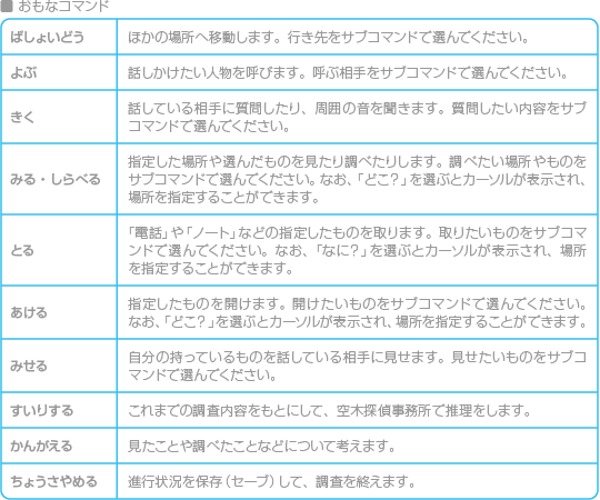 話を聞いたり怪しい場所を調べたりして情報を集め、事件の真相を解き明かしてださい。