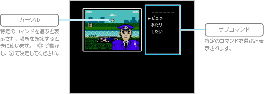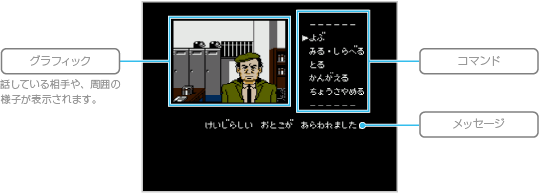 調査は画面に表示されるコマンドを選ぶことで進みます。メッセージは