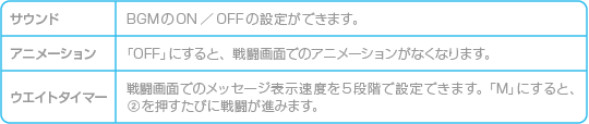 ゲームに関するさまざまな設定ができます。以下の3つのメニューのなかから項目を選び、続いて「ON」や「OFF」などの設定を選ぶと、設定が反映されます。 |