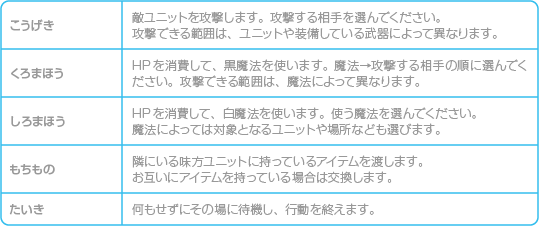 ユニットを移動させ、コマンドメニューを選んで行動の指示を出してください。 |