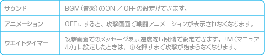 ゲームに関するさまざまな設定ができます。以下のメニューから選び、続いて「ON」や「OFF」などの設定を選んでください。 |