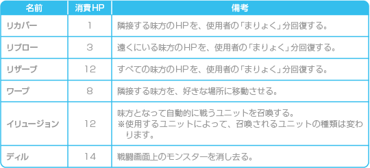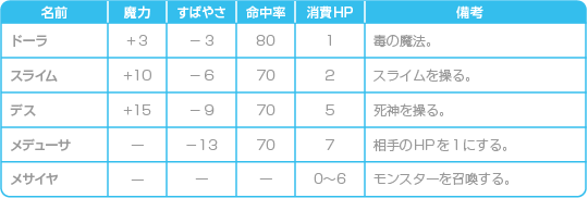 攻撃用の魔法で、基本的に射程2です。おもに「神官」「プリンセス」「魔道士」「賢者」「女魔道士」「聖女」が使用できます。